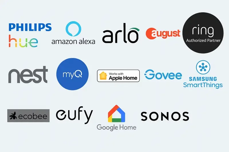 Ring • Nest • Google Home • Amazon Alexa • Ecobee • Eufy • Govee • Philips Hue • myQ • SmartThings • Arlo • August • Sonos
